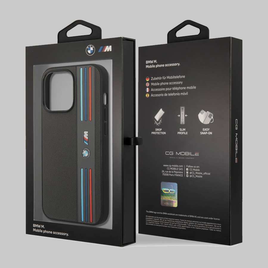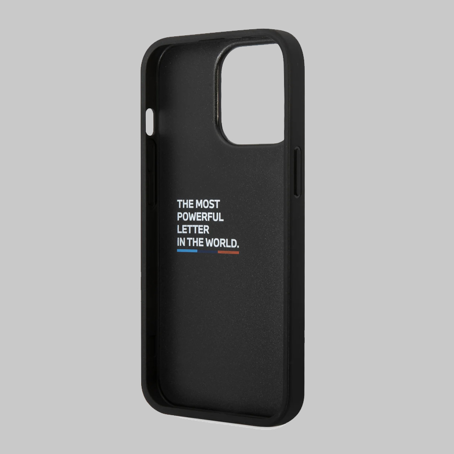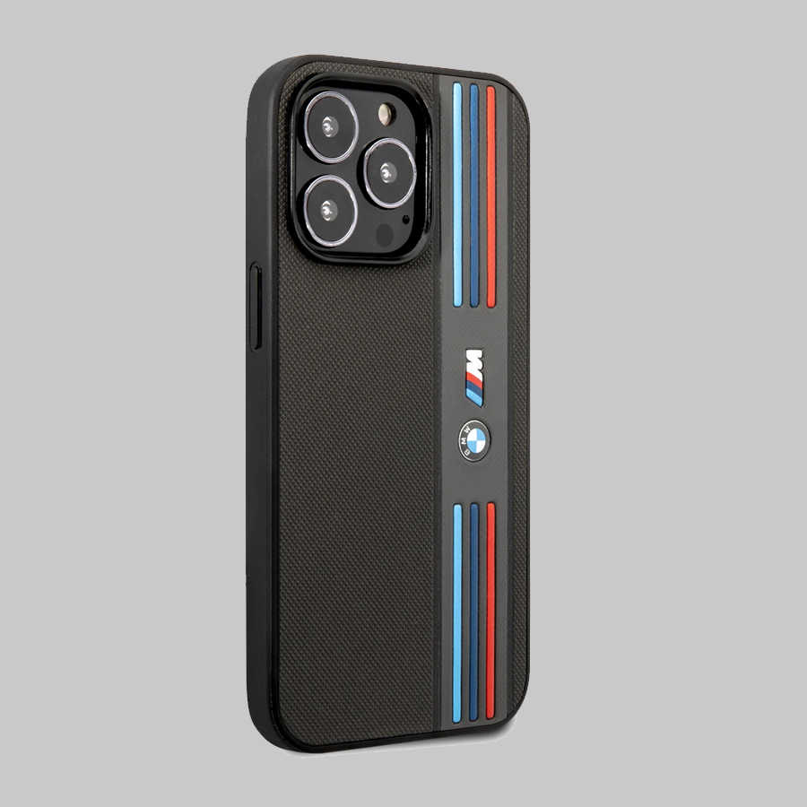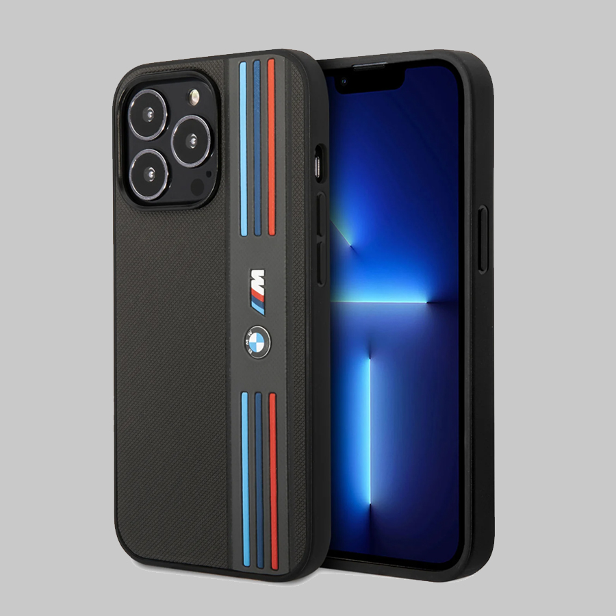 BMW- IPHONE 14 PU LEATHER GREY M COLLECTION MESH CASE AND PRINTED TRICOLOR LINES AND METAL LOGOS